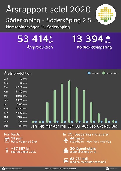 A year ago, we installed a 56 kWp PV System. An investment that proved to be successful, as the report shows that we produced 53,414 kWh of electricity during the year and saved approximately SEK 58,000. We want everything we do to be both environmentally and economically sustainable, which this investment truly is.